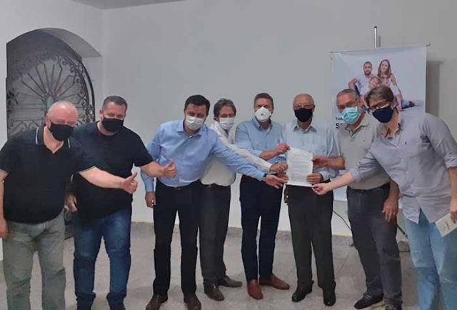 Após assinatura do convênio a imagem que entra para a história da ASPA e do HSaúde. Presidente Adilson Custódio (ASPA) exibe o documento ao lado dos parceiros.