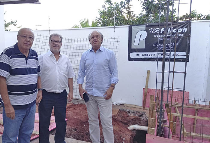 Adilson Custódio e Paulo Dimas Cezar com Dimas Ramalho na área onde está sendo instalado o elevador na sede da ASPA