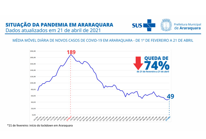 Se comparada com a média móvel diária de casos do dia 21 de fevereiro, quando começou o lockdown (que vigorou por 10 dias, até 2 de março), a última quarta-feira (21 de abril) registrou queda de 74%: a média móvel passou de 189 casos diários para 49.
