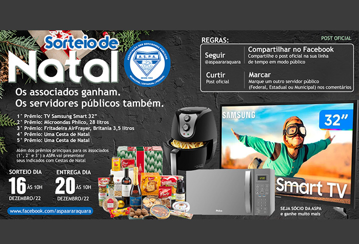 A ASPA – Associação dos Servidores Públicos de Araraquara organiza entre seus associados um sorteio de brindes visando promover a interação dos servidores públicos municipais, estaduais e federais no período das festas de final de ano.