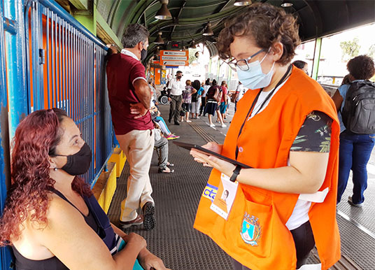 O questionário é realizado das 9h às 17h, e os pesquisadores estão devidamente identificados por colete e crachá, munidos de tablet, máscara e álcool em gel.
